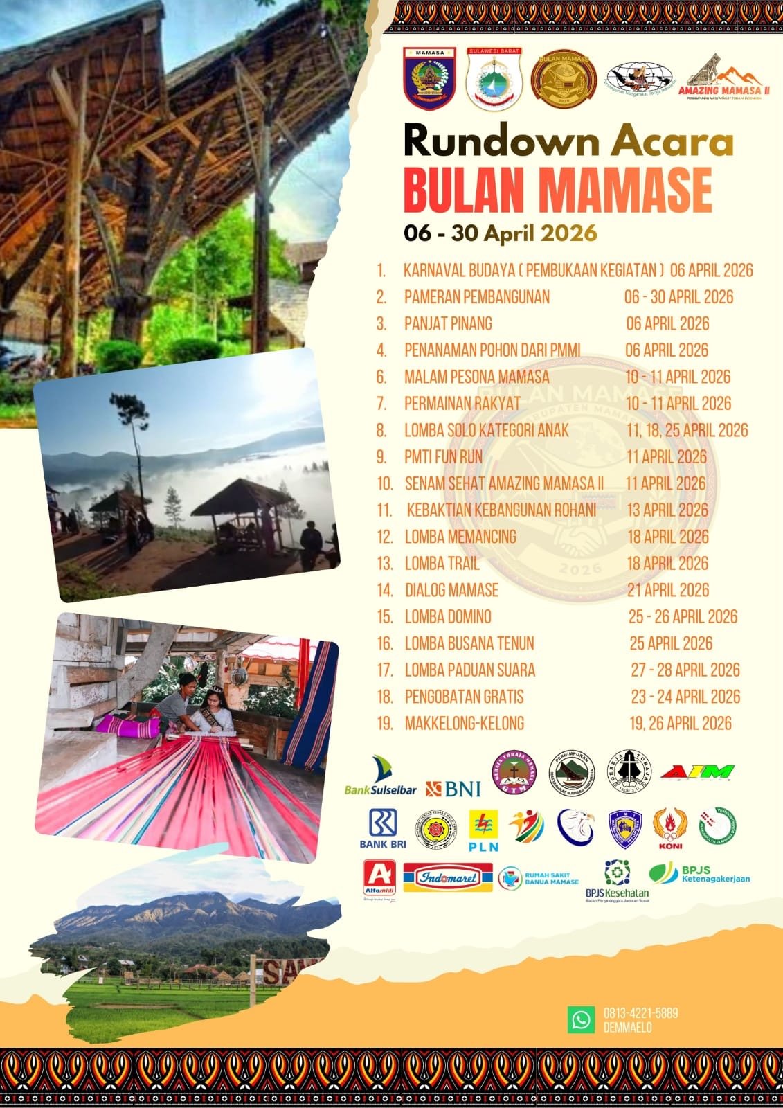 MAMASA.CYBERPENA.ID – Pemerintah Kabupaten Mamasa akan menggelar festival tahunan “Bulan Mamase” yang berlangsung sepanjang April 2026, mulai tanggal 6 hingga 31 April. Kegiatan ini menjadi momentum kebersamaan masyarakat sekaligus ajang promosi budaya, sosial, dan pembangunan daerah.